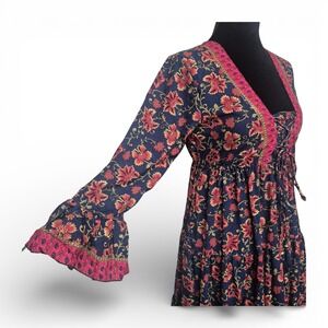 Boemo floral maxi dress in a vibrant navy and pink colorway. This bohemian-inspired piece features a deep V-neckline with a lace-up front detail and an empire waist. The long sleeves end in tiered flounce cuffs, echoing the tiered construction of the full-length skirt. Intricate floral patterns and decorative borders at the neckline, cuffs, and hem add a romantic touch to this lightweight, flowy garment. Perfect for festivals, casual outings, or beach vacations.