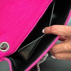 BEAUTIFUL MEDIUM PINK YSL PINK SUEDE SHOULDER/CROSSBODY PURSE WITH SILVER HARDWARE.