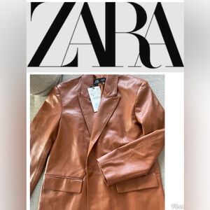 ZARA cognac faux leather blazer. Blazwr is fully lined with two front pockets and front button closer. Blazer is slightly oversized, so I am listing it as a size XS/S. NEW with tag.