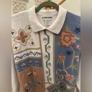Alfred Dunner collared knit sweater featuring a detailed embroidered patchwork floral design in soft neutral and muted tones. Cozy medium-weight knit with long sleeves and classic collar neckline.