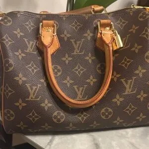 Stylish satchel with iconic monogram pattern. Features sturdy handles and gold-tone hardware.