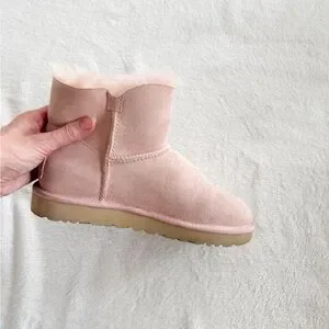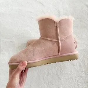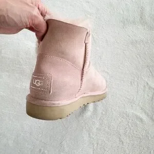UGG Mini Bailey Button Boots Blush Pink Sheepskin Suede Women’s Size 7.