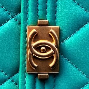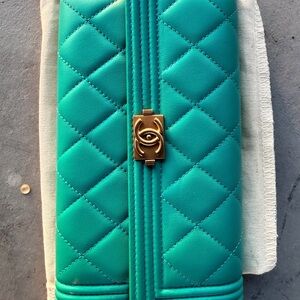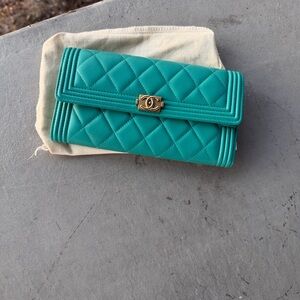 Chic CHANEL wallet in turquoise leather. Features iconic quilted design. Stylish and luxurious.