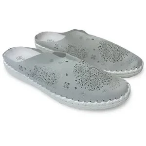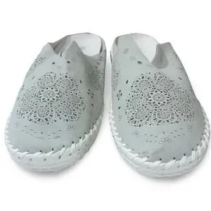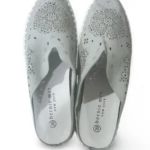 Bernie Mev Women's Tracy Slip-On Mules. Known for their blend of comfort and style, these shoes feature a distinct laser-cut floral pattern and a hand-stitched construction. The upper is made of perforated leather or suede with intricate "Mandala" or paisley cutout patterns for breathability. They include a memory foam cushioned footbed and a flexible rubber outsole. A classic slip-on mule silhouette with a round toe and a low heel (approximately 1 inch).