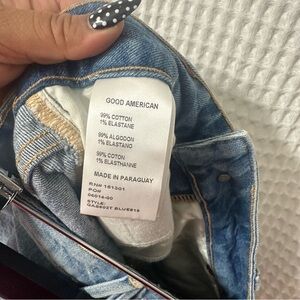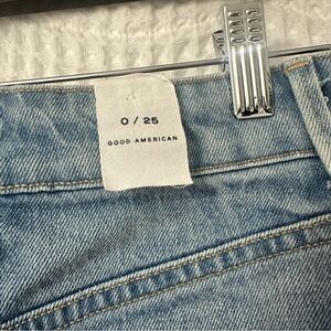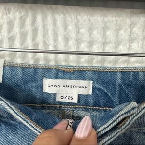 Stylish Good American denim skirt with an asymmetrical frayed hem.