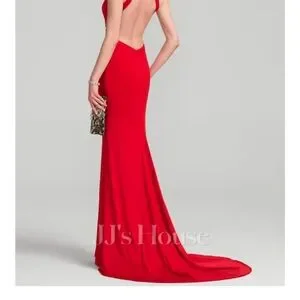 This elegant gown showcases a rich green hue and features a plunging neckline that enhances its allure. The sleeveless design and wrap style create a flattering silhouette, perfect for a cocktail event or night out. Its full-length cut adds a touch of sophistication to your evening look. Photo shown of model wearing same dress in red, one for sale is green.
