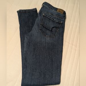 Women's size 8 X-long AE skinny jeans. Features subtle stitching and button closure.