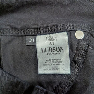 Hudson Collin skinny jeans in black denim, size 31. Features a double-button and zipper fly closure and a classic five-pocket design, including two front scoop pockets and a small coin pocket with a red and white emblem. The back features two flap pockets with button closures. All visible hardware is silver-toned.