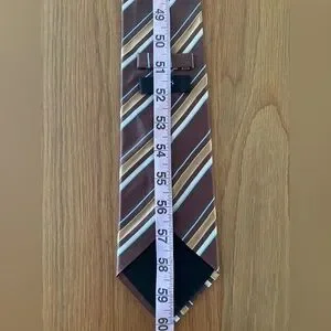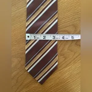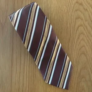 Hugo Boss Silk Tie brown base with tan, light blue, and white diagonal stripes