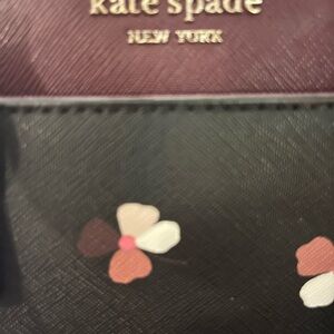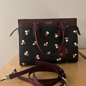 Beautiful Kate Spade New York floral Cameron Street satchel in excellent (new) condition. This structured handbag features a black saffiano leather body with delicate floral print, burgundy leather handles and trim, and signature Kate Spade gold logo hardware. Includes the matching leather luggage tag charm and optional crossbody strap.
