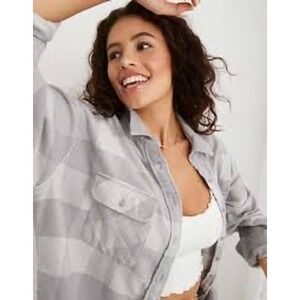 Aerie Women's Oversized Gray White Plaid Flannel Shirt Button Down- Size XS