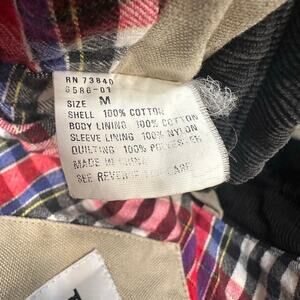 Blair Tan Twill and Corduroy Barn Jacket with Plaid Lining Size Medium. Button front. Body lined with plaid flannel and sleeves lined with quilted tan nylon. Outer fabric and plaid lining are 100% cotton. The lining is slightly lower than the outer body and needs a little alteration to fix it. Womens size Medium.