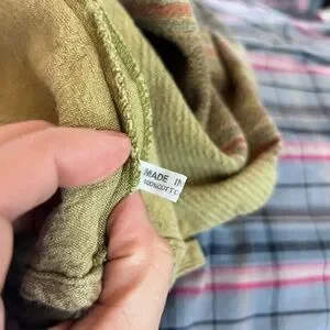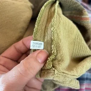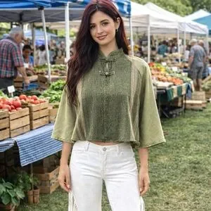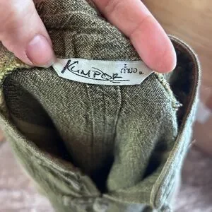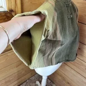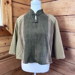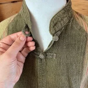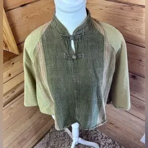 Authentic vintage cotton top made in Thailand 🌿 This beautiful boho blouse features a traditional mandarin collar with frog closures, wide kimono/batwing sleeves, and a cropped relaxed silhouette. The earthy olive and sage tones with subtle stripe detailing give it a timeless festival and travel vibe. Lightweight, breathable 100% cotton—perfect for summer, markets, travel, yoga, and everyday bohemian styling.