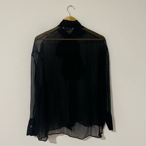 Beautiful sheer chiffon blouse from Zara in black. Features a feminine tie-neck bow detail and long sleeves. Lightweight, flowy fabric with a polished, dressy look. Perfect for work, evenings out, or layered styling. Wear with tailored shorts or trousers for a chic minimalist look, or layer over a cami for everyday wear. Brand new without tags. Never worn; no pilling, holes, or stains.