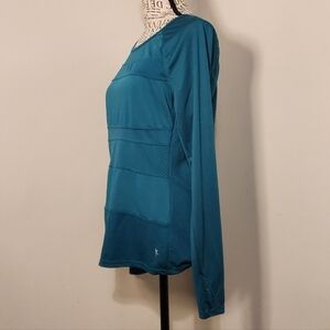 Elevate your work out wardrobe with this stylish teal long sleeve top. The striped seams adds shape to this athletic wear. sleeves have thumb holes.