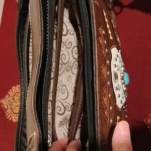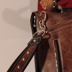 Stylish brown handbag with intricate Western embroidery and faux stones deco.
