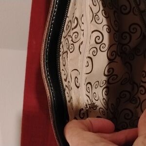 Center divider inside zipper pocket. Inside zipper pocket on back lining and two inside separate pockets.