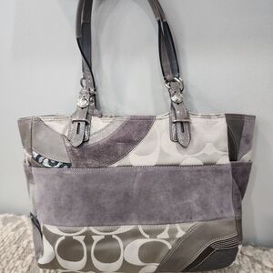 Elegant Coach shoulder bag with a patchwork design. Features gray and cream tones. Ideal for a sophisticated look. EUC. No call outs. Very clean bag. 2010. Measurements are 13 × 9