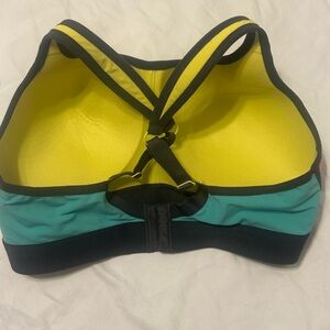Dynamic sports bra with bold color blocks. Neckline: Scoop. Style: Wire-Free Sports Bra. • Designed for mid-impact activities, such as cycling. Closure: Hook and Eye Back Closure. Fit: Fitted. • Converts to racerback with J-Hook for versatile wear.