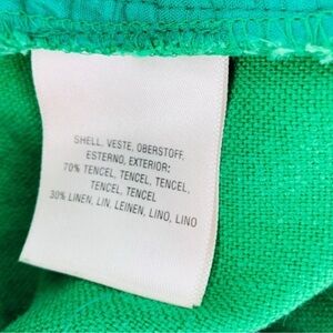 These pants by Brighton linen pants by Anthropologie are a bright Kelly green. They have both front and back pockets with button closure. These pants have a front with double button and zip fly with a front center seam. The linen has some stretch for fit and comfort.in a size 2, they measure 14” at the waist lying flat with an 8” rise and a 29” inseam.