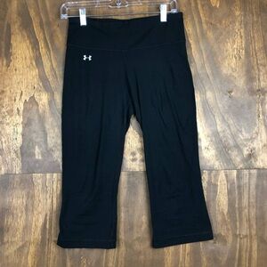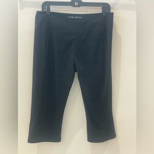 Sleek black capri leggings by Under Armour. Ideal for fitness and leisure. Fitted. Cropped leggings.
