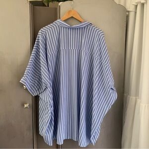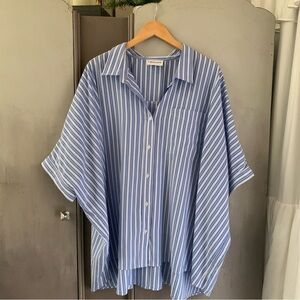 Embrace a relaxed style with this First Love shirt, featuring a classic blue and white vertical stripe pattern. The oversized fit and kimono-style sleeves offer a modern twist on a timeless design, perfect for casual outings.