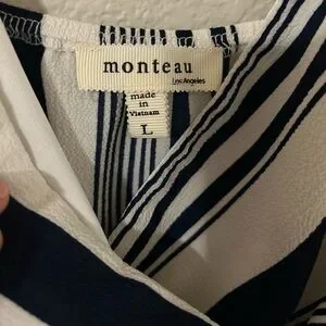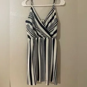 This chic and stylish Monteau Los Angeles dress is a versatile addition to any wardrobe, perfect for casual spring and summer outings, vacation, or a cruise. The dress features a classic black and white vertical stripe pattern with a fashionable wrap-style V-neck top and a flowy mini skirt silhouette. It is a women's size large with adjustable spaghetti straps and an elasticated cinched waist for a comfortable, figure-flattering fit. Made from a lightweight blend of polyester and spandex, this sundress is fully lined and in excellent used condition (EUC) with no flaws.