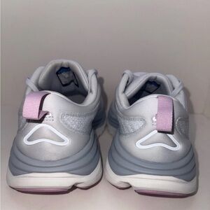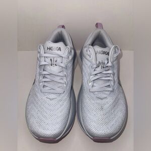 Hoka sneakers in light gray and white. Sleek design with cushioned sole.