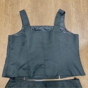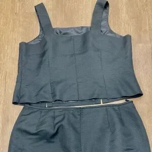 Stylish black two-piece suit set including skirt and sleeveless top. Perfect for formal occasions. Skirt closes up the back with zipper and hook closure. Too closes along the side with a zipper. Features a cute waffle type pattern.