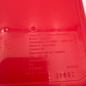Sesame Street Elmo plastic carrying case by Hasbro, dated 2017. This vibrant red hardshell case features Elmo's iconic face on the front with a molded handle for easy transport. Perfect for storing small toys, figures, or art supplies, it includes a secure latching mechanism. The exterior shows some light scuffing and minor paint wear on the facial graphics consistent with play.