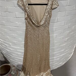 Dazzle in this glamorous gold sequin maxi dress, perfect for making a statement at any event. Some light staining on the under layer which can not be seen when wearing.