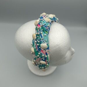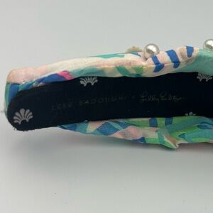 Lele Sadoughi X Lilly Pulitzer Cabana Cocktail knotted headband. Features Lily Pulitzer blue and pink colorful print/pattern. Decorated with faux pearls and shells. In good pre-owned condition. Please note some flaws: a few of the shells are not as tightly sewn against the headband, but they are still attached to the headband. Also, on the left side of the headband on the outside there is a tiny spot where makeup rubbed onto it, barely noticeable but worth noting, and on the inside of the headband at the top where the knot is there is light makeup marks. Additionally, the logo on the inside of the headband has faded, but still legible. All of the above noted flaws are shown in the product images displayed. This specific headband is no longer available on the official Lele Sadoughi or Lilly Pulitzer website. Comes with Lele Sadoughi X Lilly Pulitzer vibrant pink and green striped dust bag for storing. Please let me know if I can answer any questions about the headband prior to ordering!