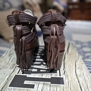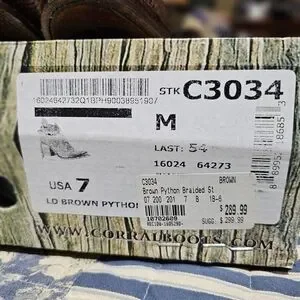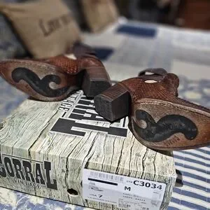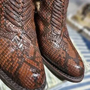 Corral brand genuine exotic python heeled shoes with adjustable ankle butyon closure. Size 7M. Accented with brown leather braiding. Like new condition. Comes from smoke-free home. Thank you for looking.