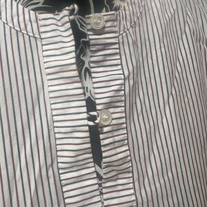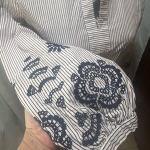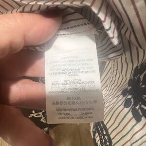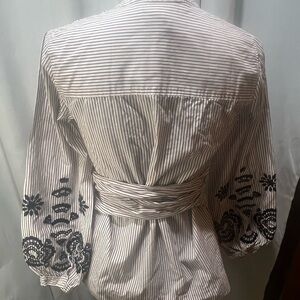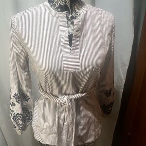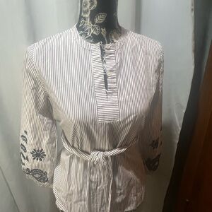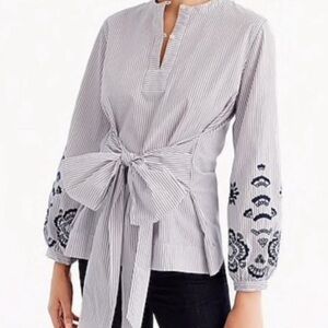 This elegant blouse from J. Crew features a sophisticated gray hue with a stylish tie front and intricate embellishments. The mandarin collar adds a touch of refinement, while the full-length sleeves are adorned with beautiful black detailing. Perfect for a chic and tailored look.