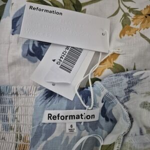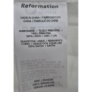 Labels/Tags: Woven Reformation label and size tag; original paper hangtag with motto "Being naked is the #1 most sustainable option. We're #2."