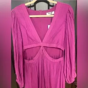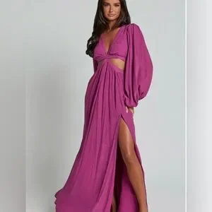 Stunning purple maxi with chic side cutouts and romantic balloon sleeves. Flattering fit-and-flare silhouette with a plunging neckline. Lightweight, soft rayon fabric that drapes beautifully. Perfect for weddings, parties, graduations, or any special event. Brand new with tags and in flawless condition.