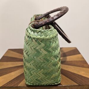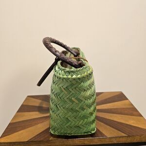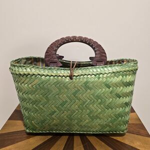 Vintage Boho Island Woven Wicker Bag Purse Rattan Green Wood Handle Beach Hippie