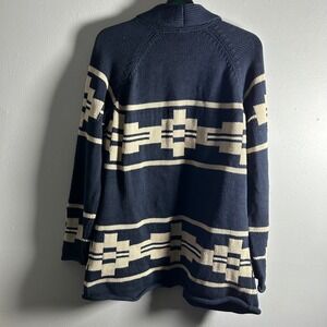 Pendleton shawl collar cardigan sweater in a navy blue and cream geometric jacquard knit. Crafted from 100% cotton, this open-front piece features a relaxed fit with dropped shoulders and long sleeves. It is equipped with two front patch pockets and a classic shawl collar, making it a versatile layering piece for transitional weather.