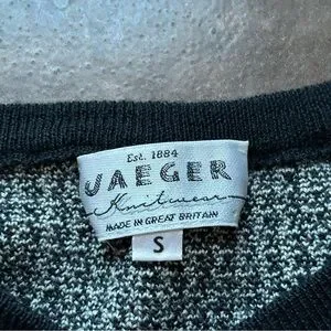 100% wool vintage cardigan by Jaeger in size small. Oversized fit with raglan batwing-esque sleeves. In my opinion can fit a medium well and up to size large. See measurements in photos