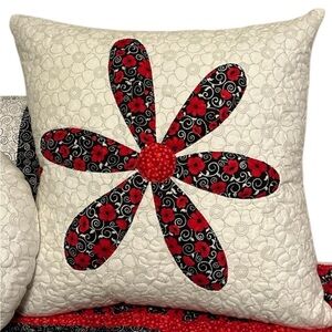 Quilt is stipple quilted all-over with hand stitched binding. Quilt-as-you go bolster, Trapunto square pillow, fusible appliqué round pillow. Quilt is 100% cotton: top, backing, batting and thread. Easy care machine wash and dry. Accent pillows are surface wash only. Pillow forms included.