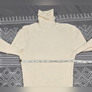 Great condition. Size small. Roll neck pullover made from fine, soft merino wool. Ribbed. Slim fit. Measurements and fabric content listed above in pictures.
