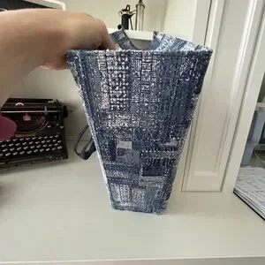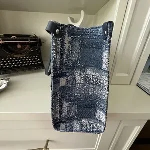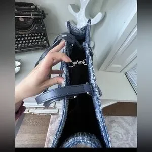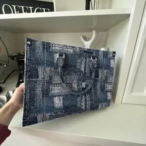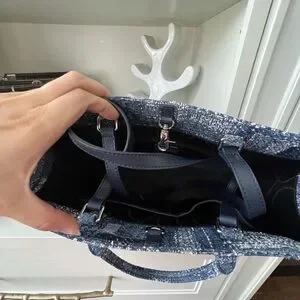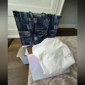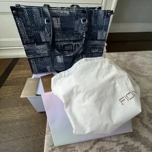 FION Oil Painting Jacquard with Leather Tote Bag Navy Blue Purse BRAND NEW