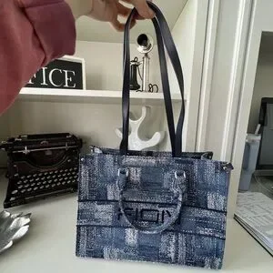 FION Oil Painting Jacquard with Leather Tote Bag Navy Blue Purse