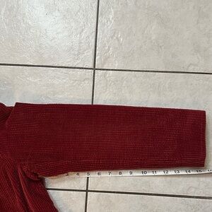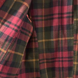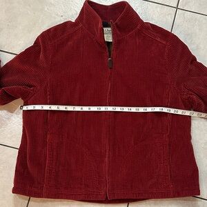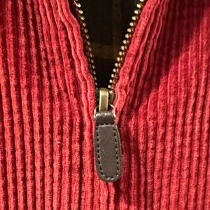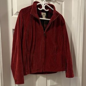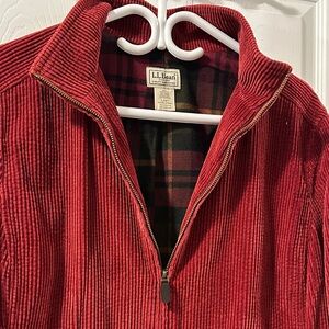 Vintage red corduroy jacket by L.L. Bean. Features a zip front and plaid flannel lining. Brass zipper & leather pull tab.