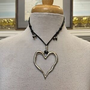 Elegant silver heart pendant necklace with a black leather cord. Adjustable and Perfect for adding a touch of sophistication to any outfit.