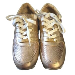 Michael Kors Osaka Runners with sparkle and shine here and there. Really pretty, lightweight, lace up natural colored laces, gum soles, non skid, cushion padding inside. Fun happy rose gold color. Size 36 EU size 5 US. Order them today ❤️
