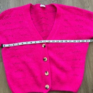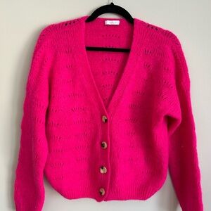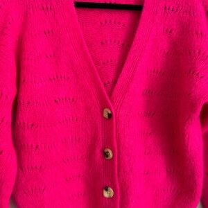 Brighten your wardrobe with this stunning Altamira Milano cardigan sweater in a bold hot pink hue. Crafted from a luxe mohair-blend knit, this sweater is soft, cozy, and lightweight with a delicate open-knit pattern throughout. Features a flattering V-neckline, button-front closure, and ribbed hem and cuffs.