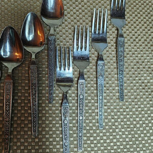 United.Silver Co Rivera Cordova Stainless Steel Silverware Flatware 20 Pieces. Service for four. 1970's. The condition is used, it does have scratches. The knives have a dark background but the remainder of the set does not. Still a great vintage set ready for another 50 years of service! I have 2 sets available and extras.