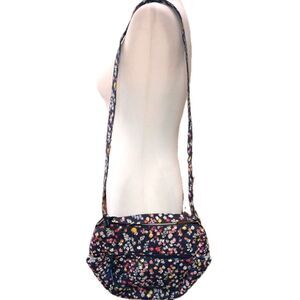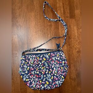 Quilted Vera Bradley crossbody bag in a navy blue floral print. Soft, lightweight cotton construction with a comfortable adjustable shoulder strap. Practical everyday size that works well for travel, errands, or daily use.