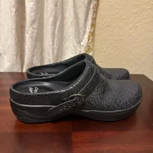 Elegant black clogs with intricate patterns. Ideal for everyday comfort.